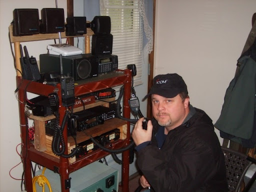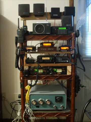 To the left is my first radio, an Alinco DJ-180 HT which served as my portable, my mobile, and my base on 2 meters through my college years. There is one of two Radio Shack FRS HT's behind it. Scanning is provided with a RS Pro-2035. From left to right is a Kenwood TM-441A, and Alinco DR-235, and an Alinco DR-135. Below those three VHF/UHF rigs is a Gap "Hear-It" DSP module, an Alinco DX-70, and a LDG AT 100 Pro autotuner. The LDG serves double-duty in the mobile as well. The SB 200 amplifier is in great shape, and I'm working on the funds to get a tuner that will handle it. Power is supplied by two Alinco DM-330 32 amp switching power supplies.